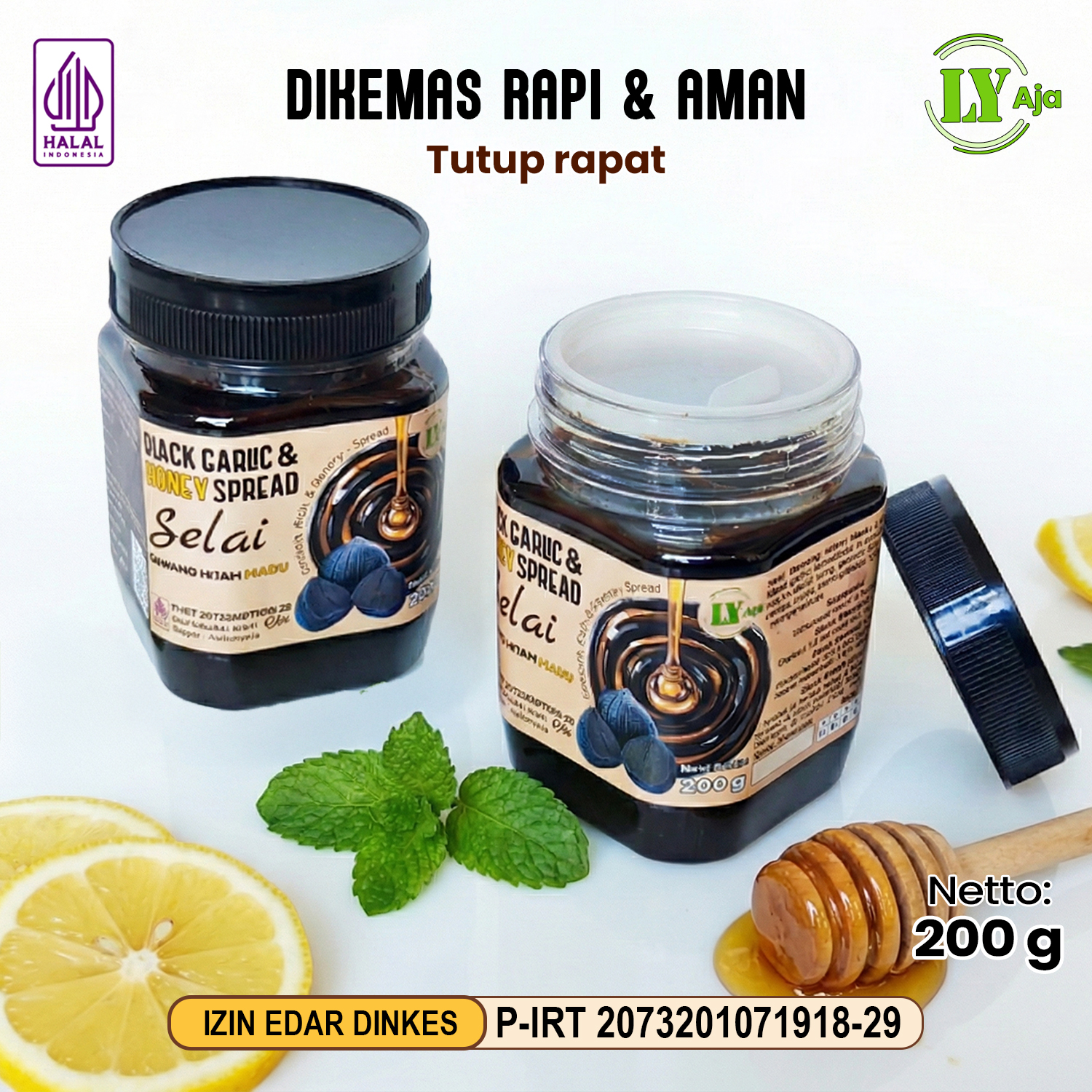 Hadirkan inovasi kesehatan modern di meja makan Anda dengan Selai Bawang Hitam Tunggal Madu (Black Garlic Honey Spread) kemasan 200 gram dari LY Aja. Perpaduan sempurna antara bawang lanang fermentasi dan madu murni yang diolah menjadi selai lembut.