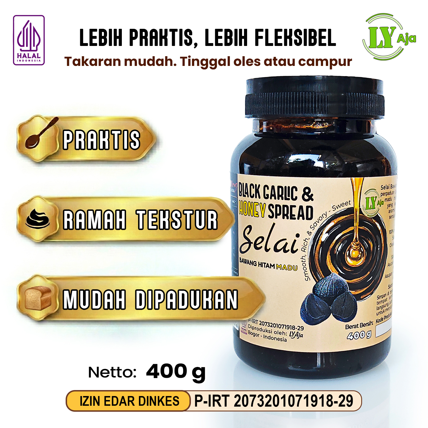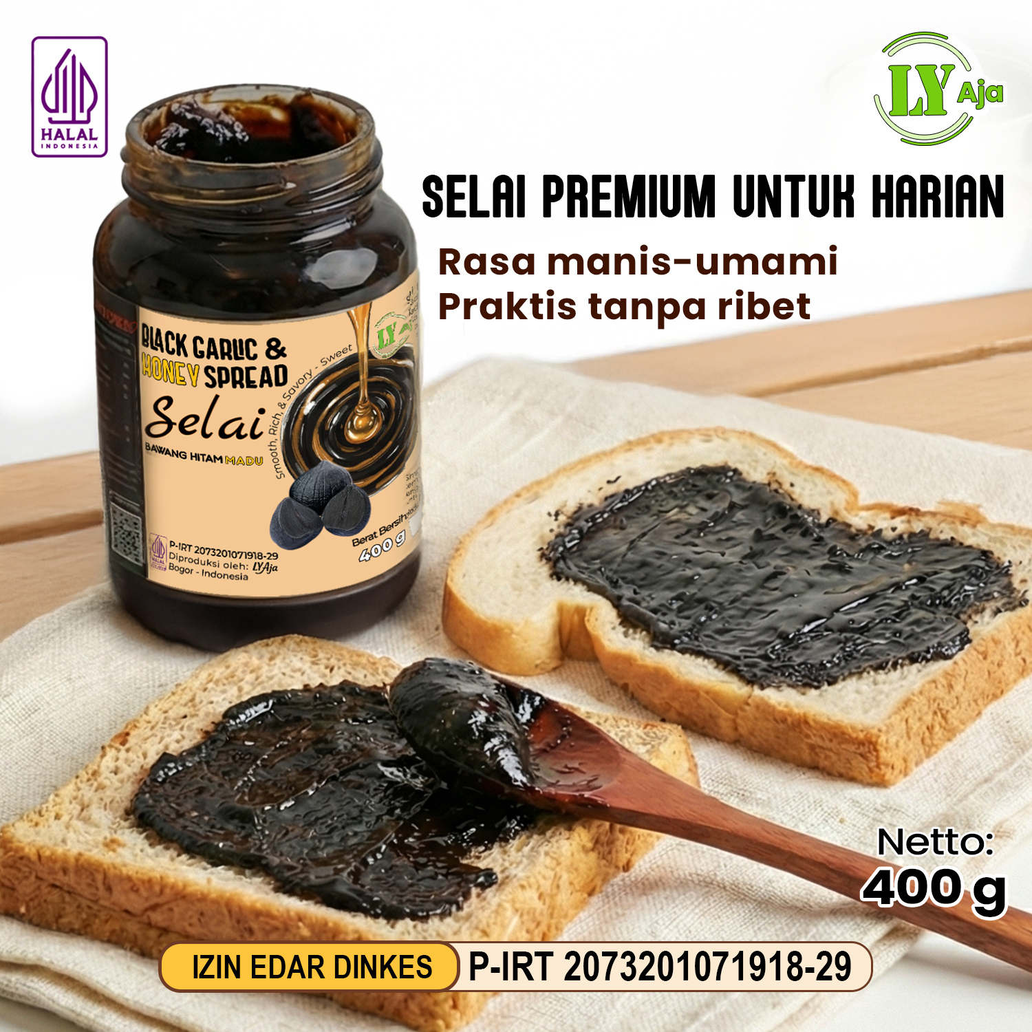 - Nama Produk: Black Garlic Honey Spread (Selai Bawang Hitam Madu).